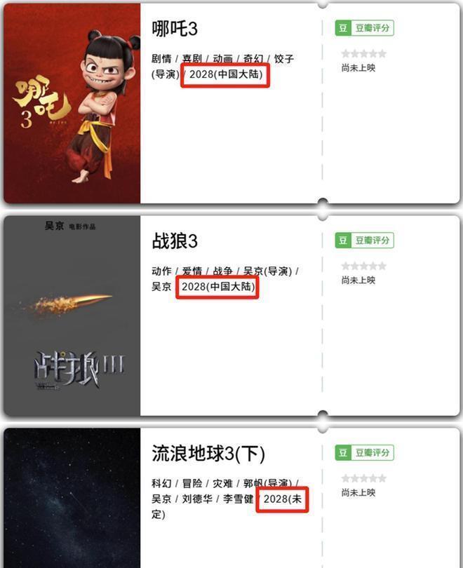关于《哪吒3》什么技能上映,现时能查询到的是2028年,这一年要至人打架了,因为《战狼3》和《流浪地球3》亦然2028年上映。