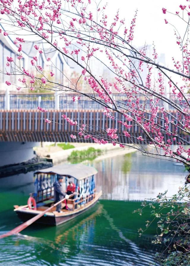 小桥活水潺潺,桥洞下摇橹客船迟缓驶过,飞檐翘角间红梅竞放,虚实相映,光影交错,化作江南春天里最动东说念主的欢娱。