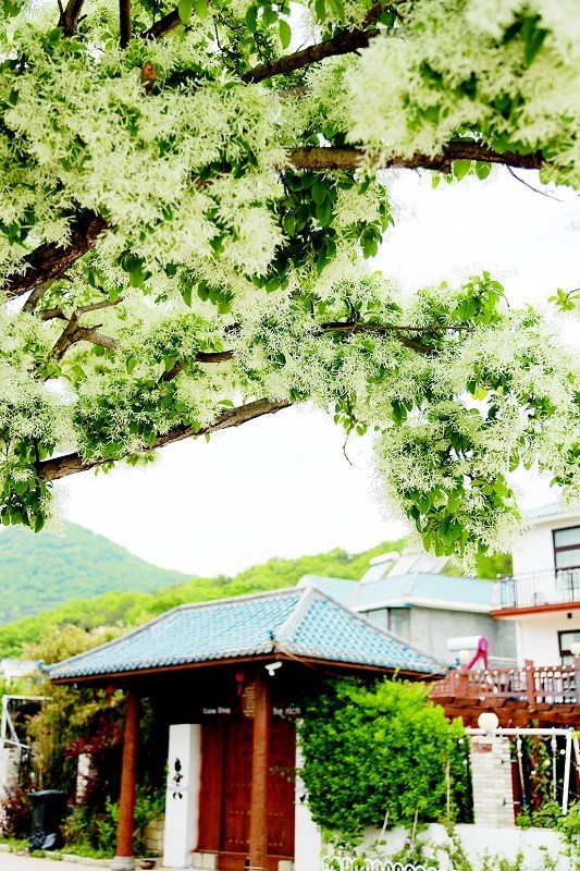 大连西郊韩家屯的这棵迂腐的流苏树,此刻静静绽开,与蓝天白云、绿水青山相映成画。