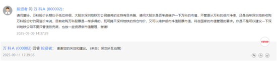 2025年9月9日,有投资者向万科董秘建议,但愿建议大股东深铁集团不要只管债务兜底,也放一些资源作念市值管制。该东说念主士以为,万科当下市净率较低,同期深铁当年收购万科的股价溢价颇高,现在增持万科股票实属一举多得,既可平摊深铁的持仓均价,又不错爱戴股票市值,顺应国度对于市值管制的导向。