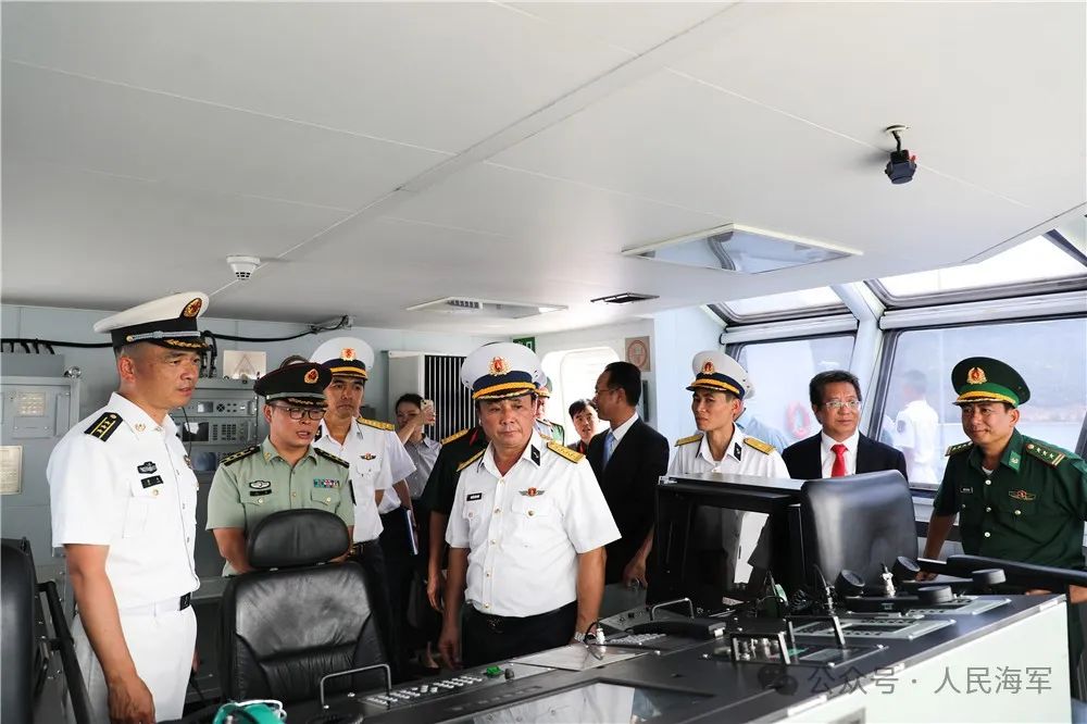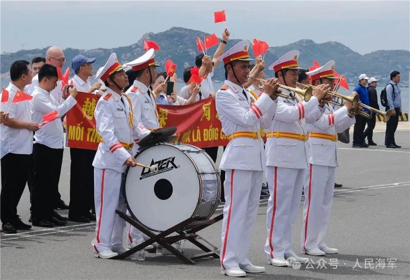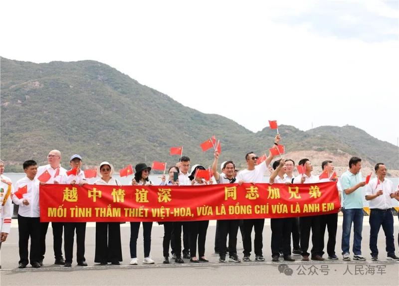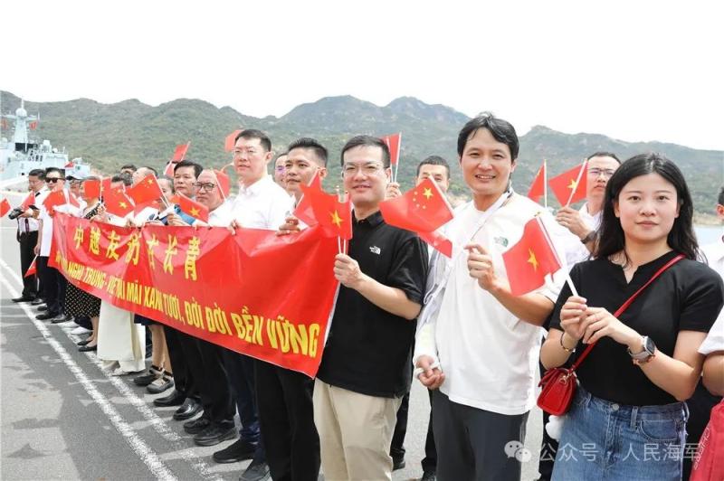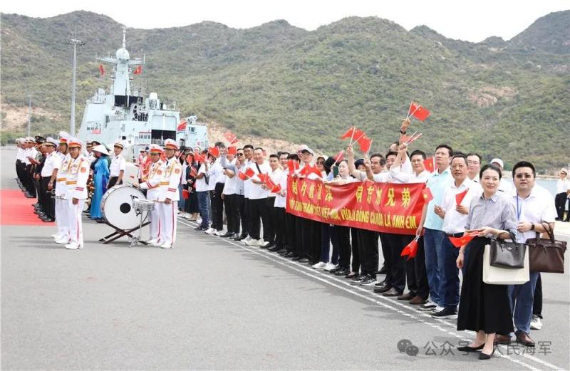 上昼6时许,越南舟师“光忠”号导弹护卫舰位金兰以东30海里处招待,为我编队指引入港。10时许,编队舒缓抵靠金兰湾海外港。越方在船埠举行肥硕宽饶庆典,宽饶东谈主群挥舞着中越两国国旗,宽饶编队到来。编队官兵身着刎颈知交军装在船面上分区排队、精神焕发,向船埠宽饶东谈主群挥手请安。