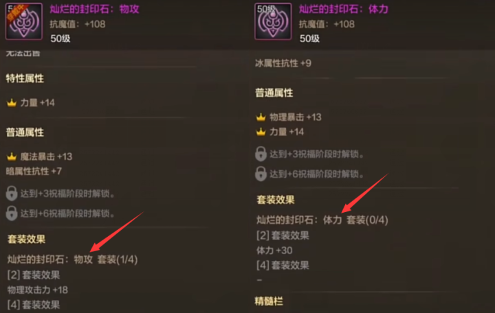 比如“封印石”和“精髓”的后缀称呼皆同为“力量”或“材干”等,现阶段只须有2个同系列即可触发2件套属性(如1个力量封印石+1个力量精髓)。