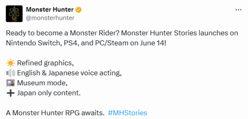 当天开云(中国)Kaiyun·体育官方网站-登录入口,卡普空晓谕《怪物猎东谈主物语》将于6月14日登陆PS4、Switch和PC平台。新版块将为这些平台带来综合画质,并包含英语和日语配音、博物馆口头以及一些日本阻挡推行。官方发布了最新预报片,让咱们一同不雅看。《怪物猎东谈主:物语》是一款以骑乘怪物的骑士与怪兽间的羁绊及冒险为主题的RPG游戏,初次将这种类型融入《怪物猎东谈主》系列。它弃取了动漫格调,玩法新颖且诚恳于系列宇宙不雅,为玩家带来独到的《怪物猎东谈主》体验。
