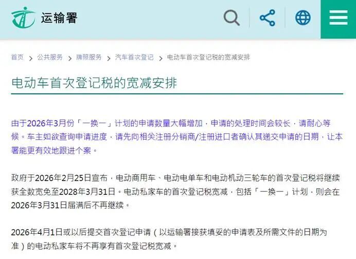 香港特区政府告示奉行8年的电动车“一换一”补贴将于3月月底闭幕,最高17.25万港元的初度登记税减免行将成为历史,这才引得许多港东说念主涌入市集抢购内地电车。