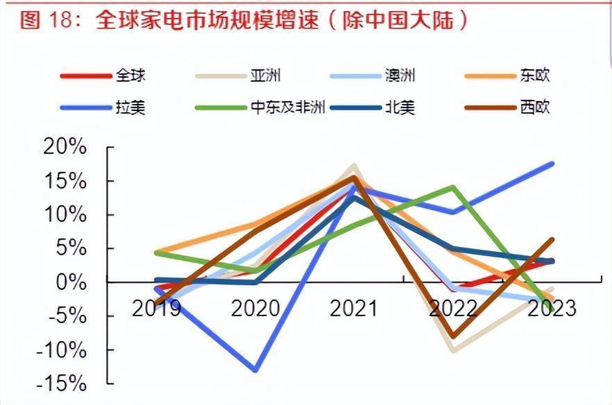 面前,家电耗尽主要阛阓仍是亚太、北好意思和西欧。左证欧睿数据,2023年公共家电阛阓范围为5287亿好意思元,悲伤中国大陆外的阛阓范围约为3933亿好意思元,其中,亚洲阛阓(除中国大陆)占21%,北好意思阛阓占31%。西欧阛阓占24%。