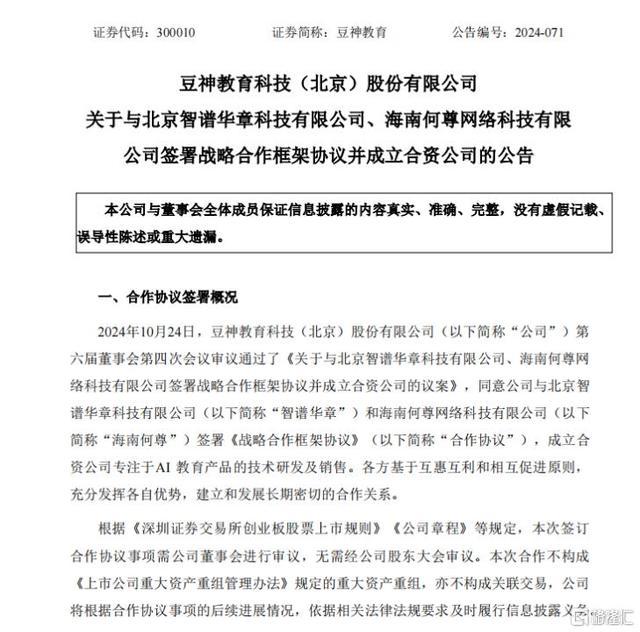 10月24日,豆神训诫发布公告称,公司将与智谱华章(以下简称智谱)成立结伙公司,专注AI训诫家具的技能研发及销售;之后的10月26日,《北京市训诫领域东说念主工智能诳骗指南(2024年)》发布,明确东说念主工智能在训诫领域诳骗圭表,指导学校、师生妥当、有序地开展诳骗执行。
