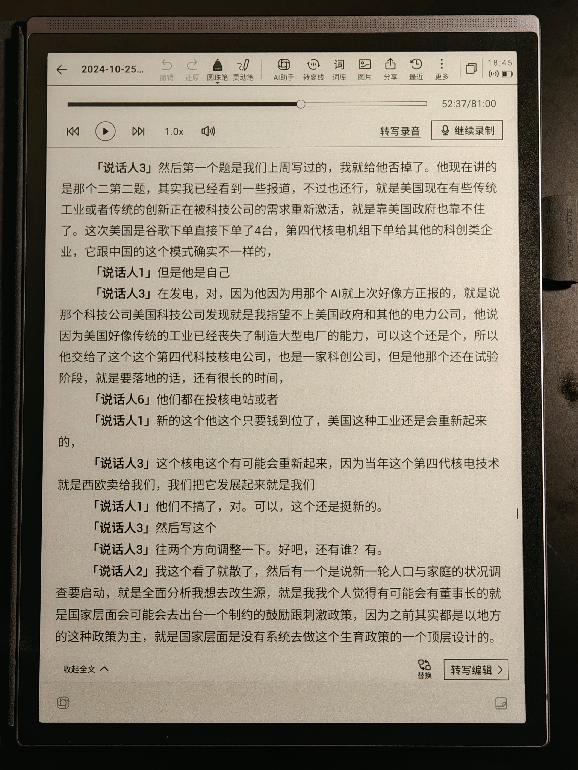 在漫长的会议里,很难一直保抓专注。讯飞办公本X3的中枢功能,是一边灌音,一边将会上筹商的内容转写成逐字稿,自动记下来,就像给开会上了字幕。