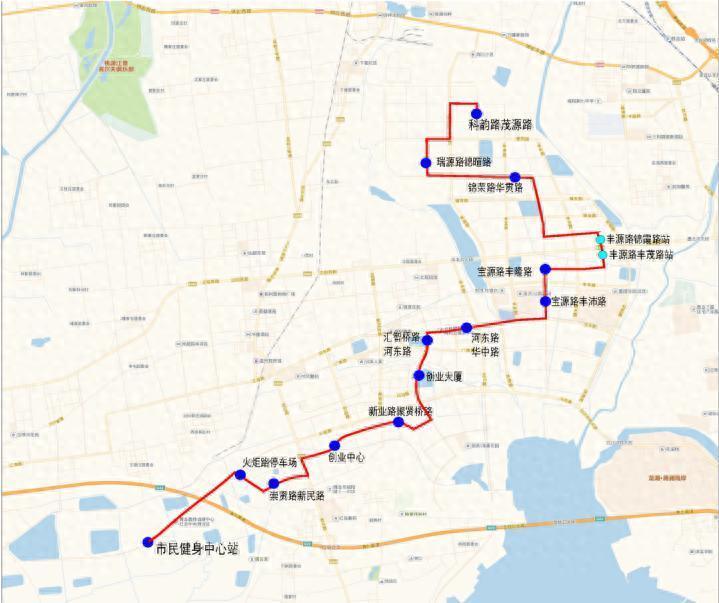 市民健身中心站—火把路泊车场—崇贤路新民路—创业中心(公交站)—新业路聚贤桥路(公交站)—创业大厦(公交站)—汇智桥路河东路(公交站)—河东路华中路(公交站)—宝源路丰沛路(公交站)—宝源路丰隆路(公交站)—丰源路丰茂路—丰源路锦霞路—锦荣路华贯路—瑞源路锦暄路(公交站)—科韵路茂源路(公交站)