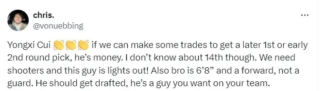 不管哪一个顺位选下崔永熙,次日设备者醒来皆会发现多了不计其数的58年铁粉,成为中国球迷新的NBA主队。